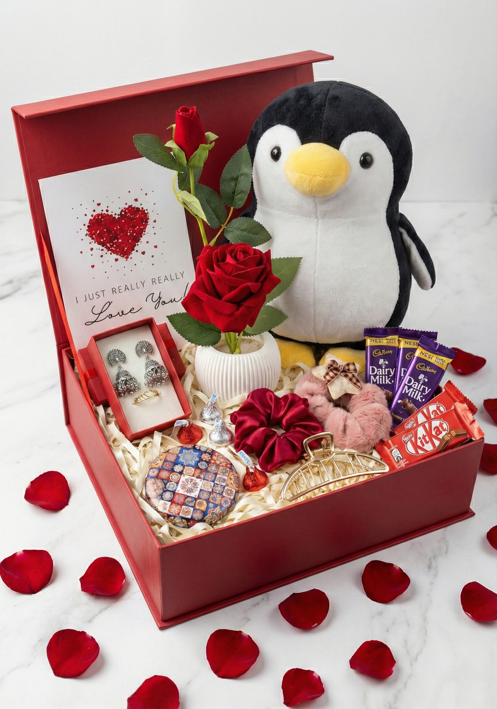 Contents: Penguin Plush, Jewellery Piece, Decorative Rose, Chocolates, Greeting Card.